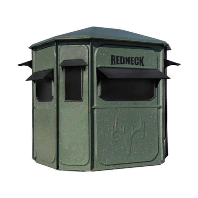 Featuring Redneck’s 360-degree window system, you’ll enjoy clear shooting lanes in every direction — with a mix of vertical and horizontal windows optimized for bow and rifle hunting alike. The Platinum Series fiberglass construction, tinted windows, and fully carpeted interior provide top-tier insulation, scent control, and stealth.