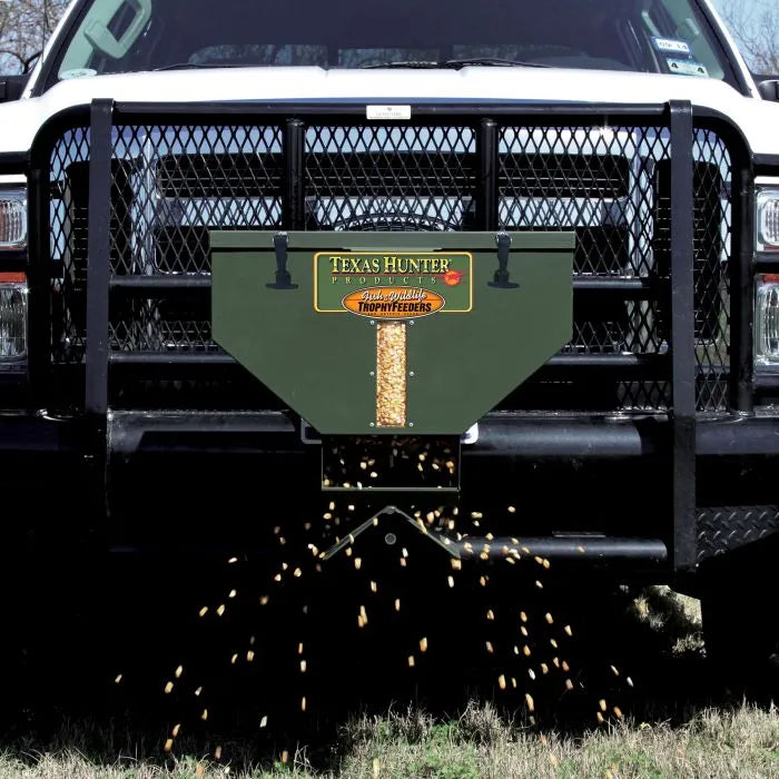 The Texas Hunter 50lb Road Feeder is a rugged, easy-to-use solution for feeding from your ATV, UTV, or truck. Designed to mount to any 2” receiver, it features two power options—connect to your vehicle’s trailer light plug or use an optional 12V battery—and dispenses feed with a simple wireless remote.
